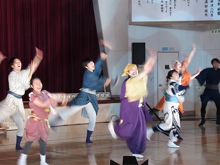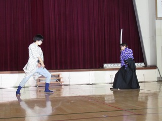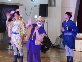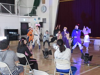 水戸黄門のストーリーを、迫力のある決闘シーンも交えながらコミカルなお芝居で好演。生徒もダンスでは手拍子を、手遊びでは役者さんと一緒に手を動かし、演劇を楽しむことができました。