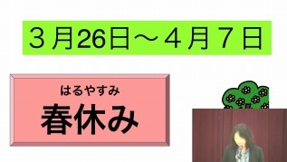 明日から春休みです。次に登校するときは進級します。みなさん、元気に春休みを過ごしてください。