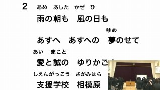 2日間にわたり、昼休み、体育館にて全校で50周年テーマソングの手話と踊り練習を行いました。テーマソングは、10月14日に50周年記念コンサートとして来てくださる、シンガーソングライターの「いわさきけんいちさん」の作曲、「相模原支援学校のみんな」の作詞による「ここにいてくれてありがとう~相模原支援学校」です。心にしみるすてきな曲です。