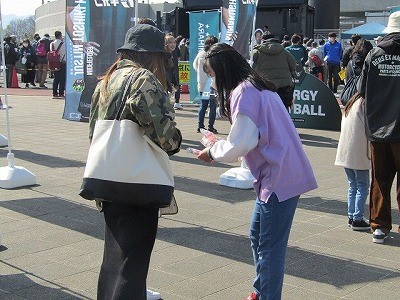 観戦グッズの配布は、4色のシリコンリストバンドを、ギオンの社員の皆さんと、笑顔で「お楽しみください」等と声をかけながら行いました。