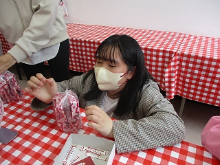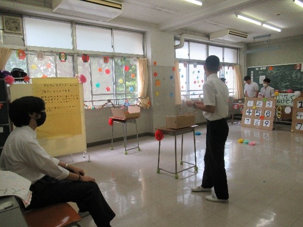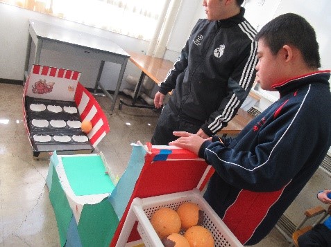 中学部2年生の生活では、“おもてなし”ということで中学部3年へ『ありがとう』の気持ちをこめて2年生お祭りを催しました。2年生はそれぞれ4つのお店に分かれ、「たこ焼き」、「車カーリング」、「金魚すくい」、「お面屋さん」の店員をしました。生徒達同士の関わりが多く生まれたり、沢山の笑顔と歓声が生まれた有意義な時間となっていました。