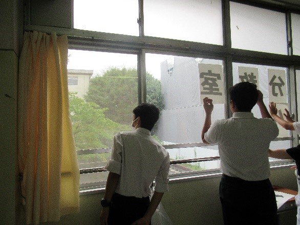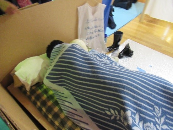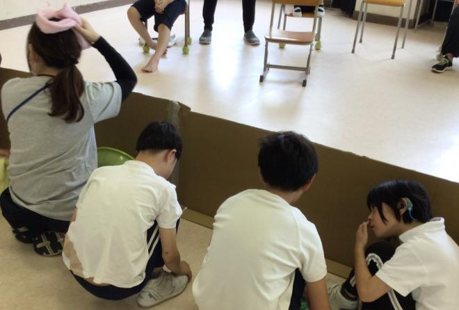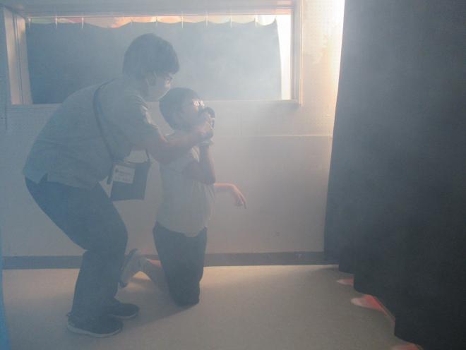 9月26日、生活単元の防災学習で煙体験を行いました。プレイルームの一部をブルーシートで仕切ったあとにスモークマシーンで煙を発生させて煙体験ハウスを作り、タオルを口に当てて低い姿勢を取りながら避難する訓練をしました。
