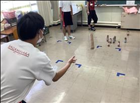 9月19日、高等部2年では夏休み明けから、宿泊学習に向けて体力づくりでモルックの練習をしています。ルールをしっかりと覚えて、準備や得点計算を協力して行っています。日に日に投げるのが上手になってきました!写真はクラス対抗戦の様子です。