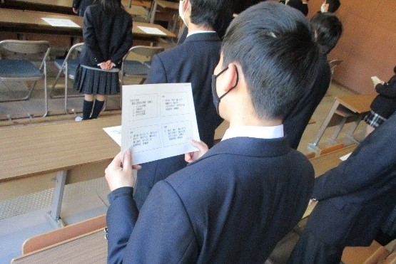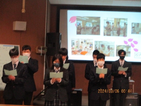 3年生からは卒業式で歌う「ココロノナカ」の合唱のプレゼントや楽しいレクリレーション、3年間のアルバムを披露してもらい、1、2年生は発表を見ながら、涙する生徒もいて、感動的な時間を過ごしました。3年生は残り少ない学校生活を楽しんでもらいたいと思います。