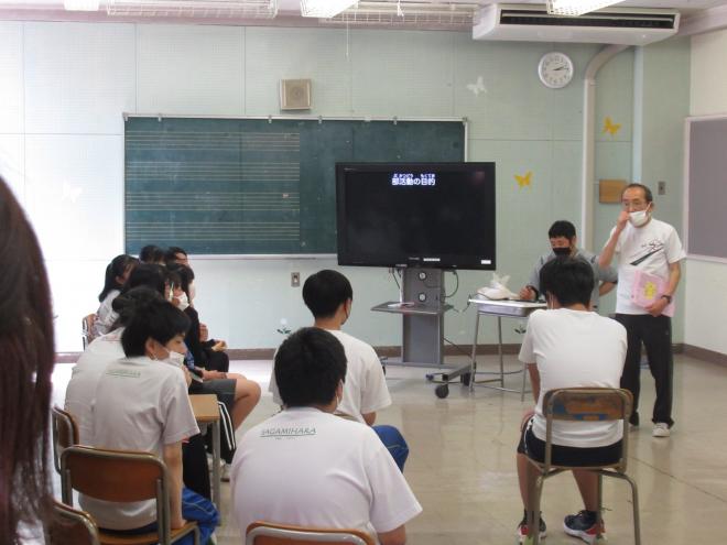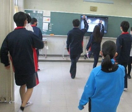 7月13日、中2の音楽では“夏を少し早く先取り”ということでエビカニクス音頭という盆踊りの身体表現(ダンス)を行っています。手にハサミをつけたり、カニやエビのお面をつけて、BGMに合わせて踊っています。前で踊る教員を模倣しながら真剣な眼差しで盆踊りをしました。