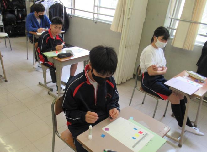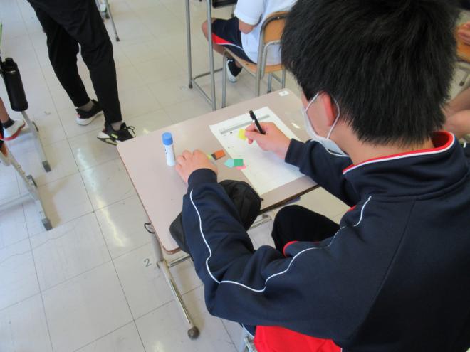 5月10日、美術の授業では、2色以上の色を選び、その色に関するクイズを考えました。色から想像できるイメージを膨らませてクイズを完成させました。その後、出来上がったクイズを出し合い、答えを考える楽しいクイズ大会を行い大いに盛り上がりました。