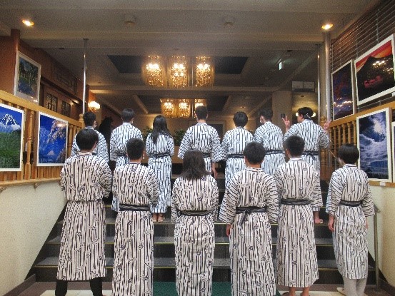 ホテルでは、夕食や温泉、レクリエーションを楽しみました。2日目の箱根では、寄木細工を作ってお土産にしました。