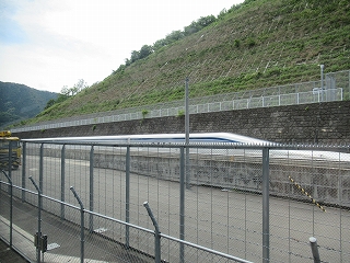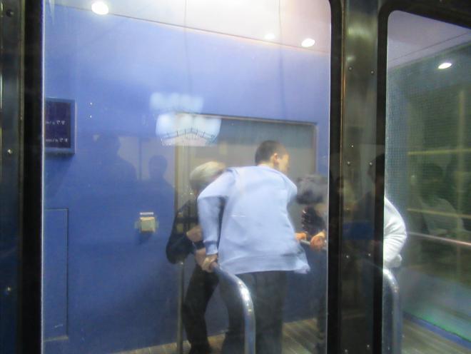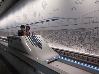 リニア見学センター。展示車両を見学中・・・。モニターに走っているときの様子が映っています。