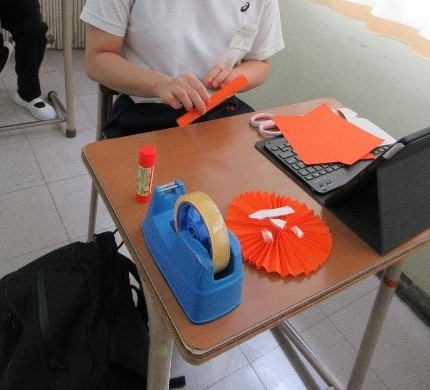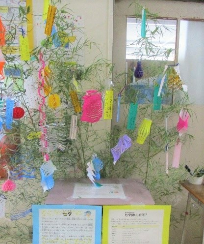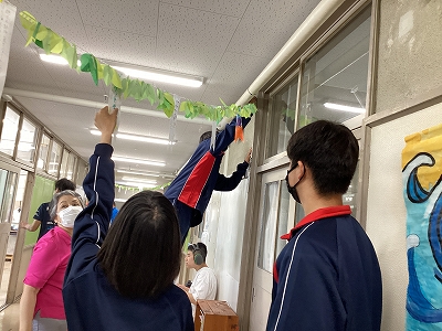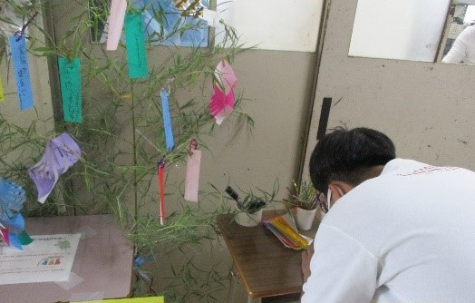7月5日、七夕の笹に飾りつけをしました。飾りつけるものは生徒が自分で調べて折り紙で作りました。笹もとても華やかになり、他のクラスの生徒や教員から「すてき♪」「きれい♬」と声が上がると、とても嬉しそうな表情をしていました。短冊に願いをのせ、七夕の日を心待ちしています。