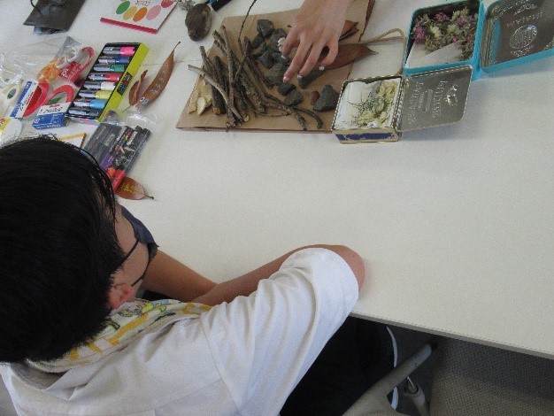 7月10日、多摩美術大学との交流に行きました。「カードゲーム」、「いきものたち」、「コラージュ俳句」、「自分だけの名札づくり」の4グループに分かれて活動しました。どのグループも分かりやすく、ていねいにやり方を示してもらったり、助言を受けて笑顔で活動に取り組みました。