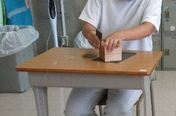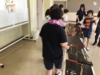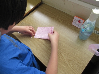 6月26日、牛乳パックを使って、手作りハガキを作りました。牛乳パックと好きな色紙をちぎってミキサーに水と一緒に入れてよく混ぜて、専用の紙すきキットに流して水を切って乾燥させて完成です。