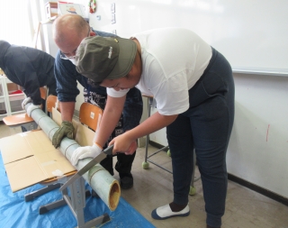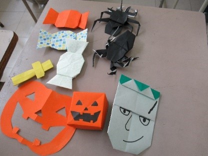 9月27日、分教室の職業の授業を紹介します。分教室の職業班は『カフェ班』『受注班』『当麻田小班』『図書班』『サービス班』があります。今回はサービス班の様子を少し紹介します。サービス班は様々な依頼を受け作業を行う班です。写真は、机の脚台とハロウィンの飾りを制作しているものです。この他にも草取り、メモ帳作り等の作業を行っています。