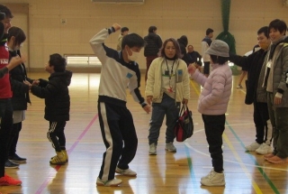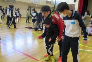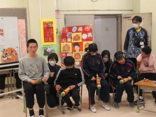 12月8日の生活単元で、歳末行事について学習しました。その中で学習した年越しそばをテーマに「そば運びゲーム」をしました。段ボールで作ったざる盛り(そばを入れる容器)を、3段に重ねて持って落とさないように運ぶリレーです。アゴで落ちないように抑えたり、頭の上に乗せて運んだりとそれぞれ個性的な運び方をしていました。最後にクリスマスのパネルシアターを見ました。