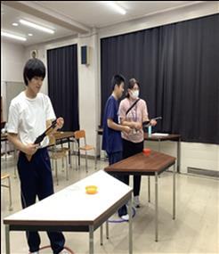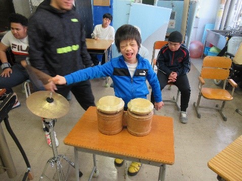 6月21日、高等部3年生は現在、産業現場等実習(現場実習)の真っ最中です。一人ひとりが自分の将来を見据えながら実習先で頑張っています。そのため、いつもは2グループで行っている音楽ですが、人数が少ないので全員で行いました。そして、玉子焼き器も楽器になることが新鮮な驚きでした!