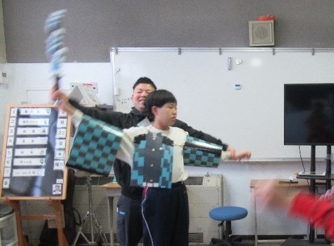 中学部2年生の音楽では身体表現では2月…節分ということもあり、鬼滅の刃をテーマにダンスを踊っています。また器楽では「愛をこめて花束を」という曲に合わせて今年度使ってきた楽器を使用しての演奏を行っています。生徒自身が衣装や演奏したい楽器を自分で選んで表現してくれています。