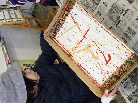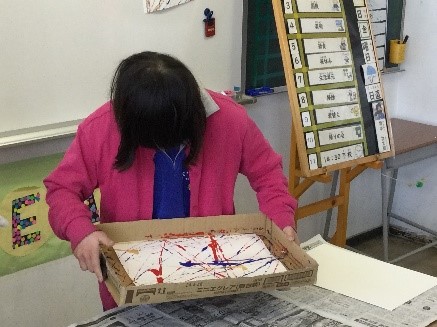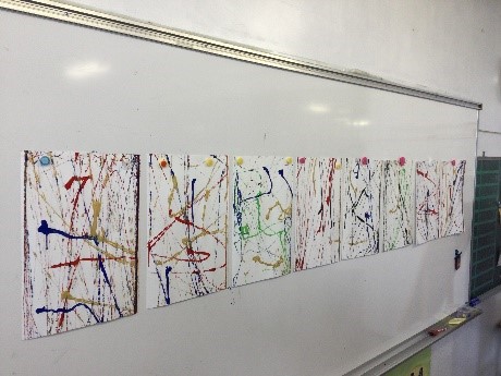 3月8日の美術の時間にコロコロアートを作成しました。5色の中から3色好きな色を選び、模造紙の上に絵の具のついたビー玉を転がして模様を付けました。生徒によってビー玉の転がし方が異なり、一人ひとり個性豊かな作品を作ることができました。