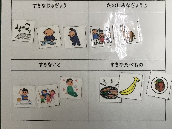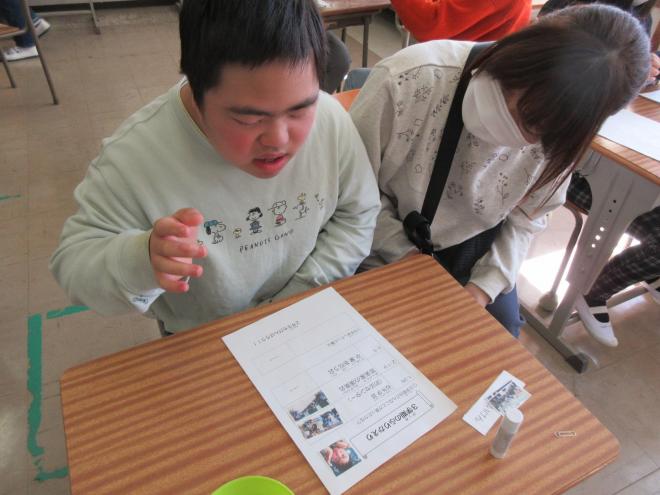 3月21日、キャリアパスポートを作成しました。キャリアパスポートとは、小学部から高等部までの学習と活動の様子を記録したものです。3学期に学習した内容を確認しながら写真シールを貼ったり、1年間で1番楽しかった活動を書いたりして発表ました。