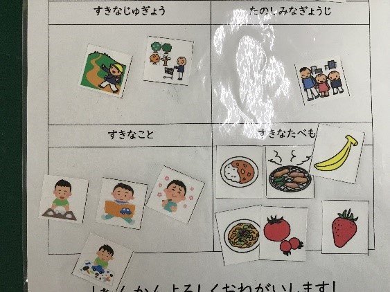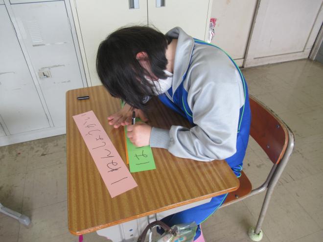 4月12日(水曜日)、新入生歓迎会に向けて、自己紹介カードの作成を行いました。自分の好きな授業や自分の好きな食べ物、楽しみな行事などの項目に自分の選んだシールを貼りました。