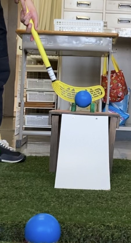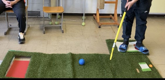 5月15日、中学部2年生では、生活単元の授業で宿泊学習の雨プログラムで行う「パターゴルフ」をしました。クラブを握り、ホール目指してボールを優しく打ったり、力強く打ってみたりと試行錯誤しながらクラスメイトや教員と楽しく対決しています。