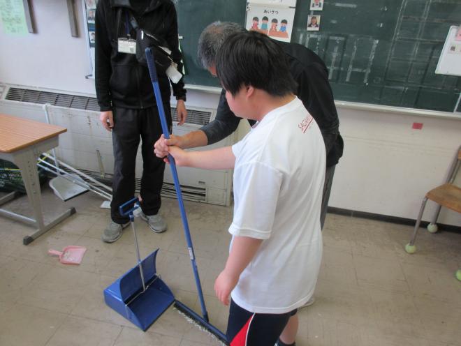 5月29日、生活単元の授業で掃除の学習をしました。教員と一緒にほうきでごみを掃いたり、フローリングワイパーで細かい埃を取ったりしました。キレイになりました!