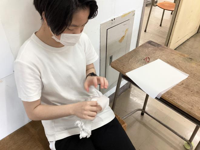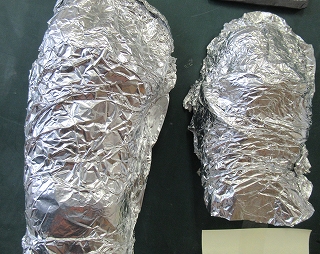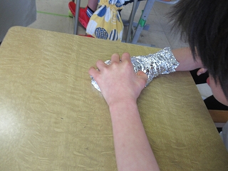 6月30日、中2の美術では、自分の彫刻づくりを行いました。アルミホイルで自分の手や体などを包み、模る(かたどる)という課題です。アルミホイルのサラサラした触感や少しひんやり冷たい感じが心地よいのか、生徒たちは皆落ち着いて、じーっと模っている自分の体を眺めながら行いました。出来上がったものはそれぞれ形や大きさ、凹凸が異なり、生徒それぞれの雰囲気が出る作品となりました。