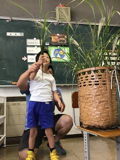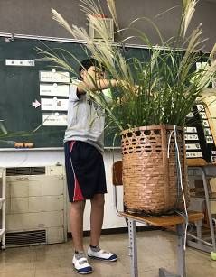 10月4日、美術の授業では、“メイメイ”と名乗る謎の講師?教師?が来て、“”メイメイさんの故郷である中国の文化を紹介しました。今回は十五夜も近かったことから、「フラワーアレンジメント」ということで学校に生えているススキを収穫し、竹籠に挿しこんでいくという活動を行いました。立派なススキに少し引け腰の生徒もいれば、そんなススキにも負けずに豪快に竹籠にススキを挿しこんでいる生徒の姿も…クラスの皆で素敵なフラワーアレンジメントを作りました。