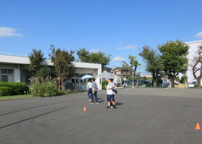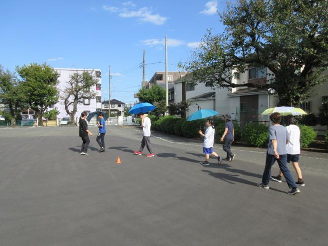 10月17日、11月の校外学習に向けて傘をさして歩行する練習をしました。校外学習当日は晴れることを祈っていますが、万が一雨でも、傘をさして濡れないようにしたいと思います。