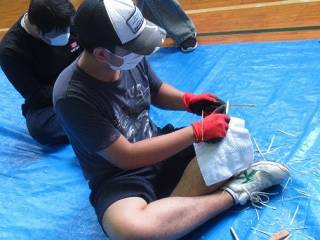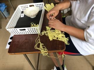10月10日、後期の校内実習がスタートしました。各グループごとに作業を行っています。軍手の糸ほぐしは、コツをつかむとスルスルほどけます。