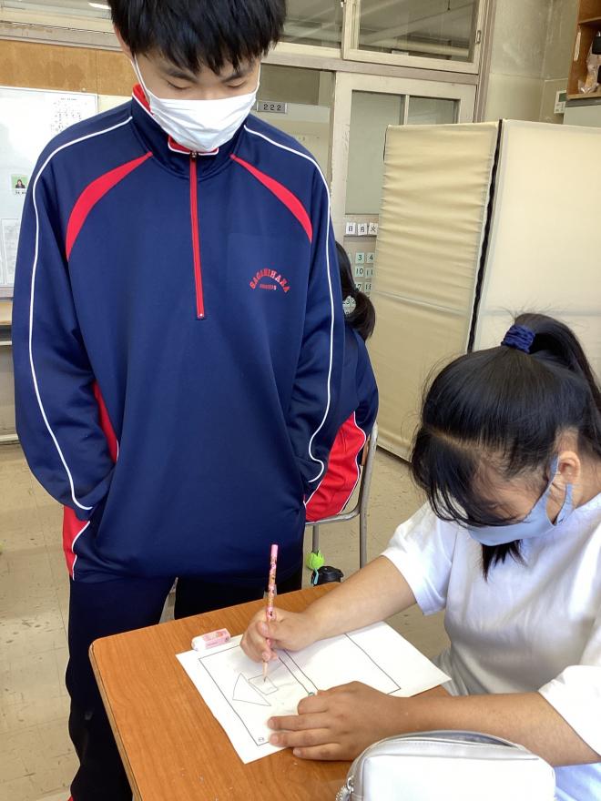 4月27日、国数の時間に図形伝言ゲームをしました!図形伝言ゲームとは、お題となる形をみて言葉だけで伝えるゲームです。まる、さんかく、しかくなど…みんな楽しそうにやっていました。