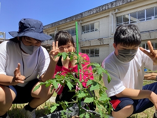 5月24日、ロングホームルームの時間にミニトマトに水やりをしました。社会生活の時間で育てています。花が咲いていたので肥料を何個か入れました。早く成長してくれるとうれしいです。