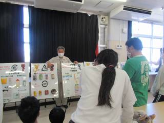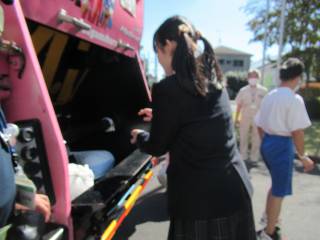 10月26日、清掃局職員の方をお招きして授業を行われました。教室で、ごみ分別やリサイクルについての事前授業(オリエンテーション)を受けてから、前庭で本物の清掃車に試乗したり、ごみを実際に投入する体験ができました。日ごろなかなかできない体験をすることができました。
