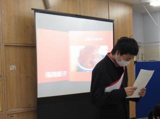 2月29日、「3年生を送る会」を3月に開いてもらう予定です。昨年度は送る側でしたが、3年となった今回は、送られる側になります。学年での出し物を発表するのは、これが最後の機会となるので、後輩たちにとって忘れられない「3送会」となるように、張り切って準備を進めています。「世界の料理SHOW」として、韓国・タイ・イタリアの3か国の料理や現地の言葉などを紹介します。後輩たちのツボにはまるように、お笑いの要素を詰め込んでいきたいと思います。