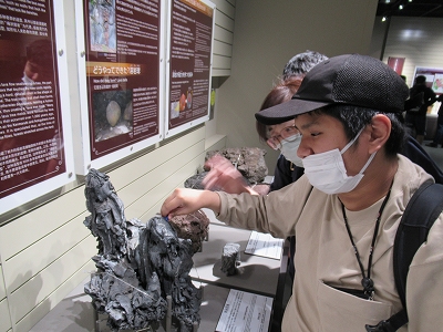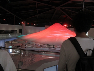 富士山世界遺産センター。富士山は文化遺産ですと教わりました。中央の富士山はだんだん色が変わっていききれいです。赤くなったときは「あー、きれい」とどこからか声が聞こえました。溶岩が固まった物は細長くニョロニョロしている物がありました。
