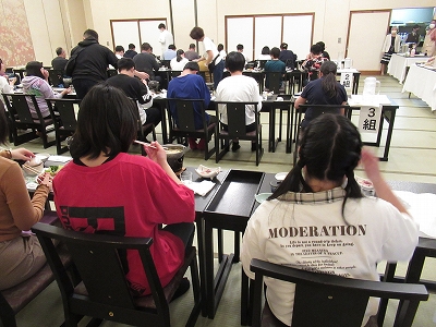 桔梗屋の工場見学と信玄餅の詰め放題!みなさん真剣です。おしゃべりがあまり聞こえてきません。