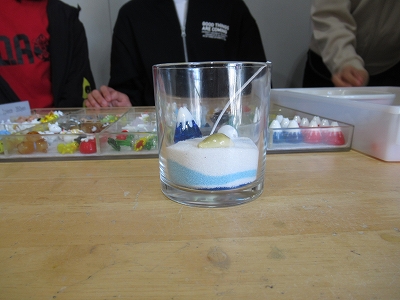河口湖クラフトパーク。ジェルキャンドルを作りました。色砂を入れて、貝殻とマスコットを入れます。この後はスタッフがジェルを入れてくれます。出来上がりがたのしみ!