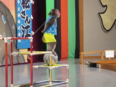河口湖猿回し劇場。かわいいお猿さんがジャンプ、玉乗り、竹馬等、難しい演技を見せてくれました。小さいけどスゴイです。