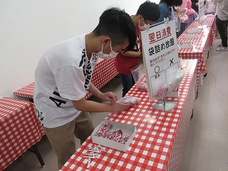 9月8日(金曜日)、9日(土曜日)、橋本高校文化祭に参加しました。分教室は、ストラックアウトゲーム(縁日)、パンの販売(模擬店)を出店しました。ストラックアウトでは球を投げるたびに、「いいですよ!」と、気持ちを盛り上げました。球を投げた後、おみくじを引いたお客さんやパンを買ってもらったお客さんに「ありがとうございました!」と、元気に伝えました。1年生の元気な言葉でたくさんのお客さんが笑顔になりました。