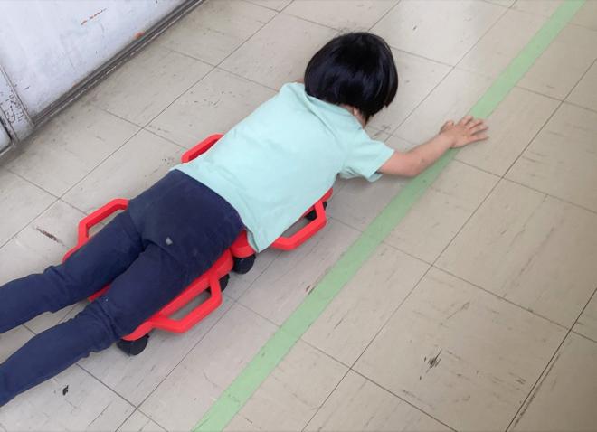 7月3日、廊下でからだつくりを行いました。キャスターボードでGO!見た目よりも速く進んでいます。どの児童も頑張って取り組むことができました!
