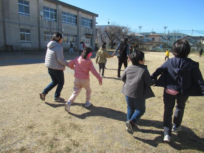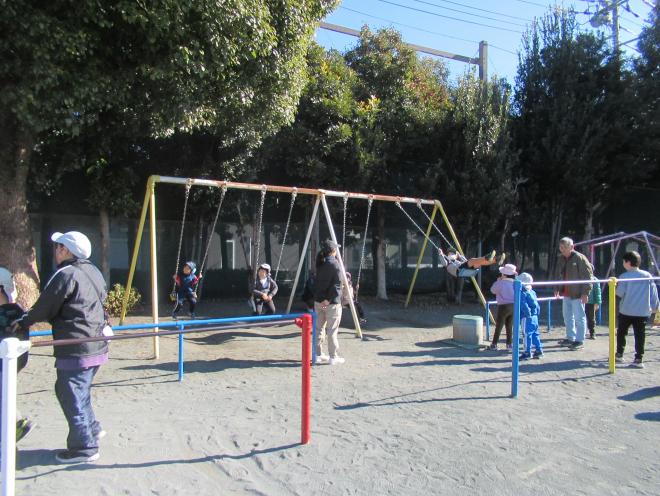 1月14日(火曜日)天気晴れ、地域交流の一環で、ゆめのおか小学校のグラウンドを利用させてもらっています。人気はブランコとシーソー!シーソーは最大8人利用で盛り上がってます!順番を譲り合いながら仲良く遊んでいます。