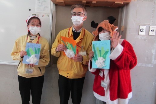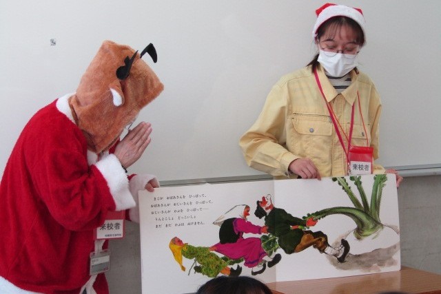 クリスマスが近いということもあり、トナカイやサンタさんに変身して登場!小学部の児童を対象に明るい雰囲気を作りながら、柔らかい声でゆっくりわかりやすいスピードで読んでいただきました。小学部のみんなも集中して見ることができました。イオンフードサプライ株式会社の皆様、本当にありがとうございました。