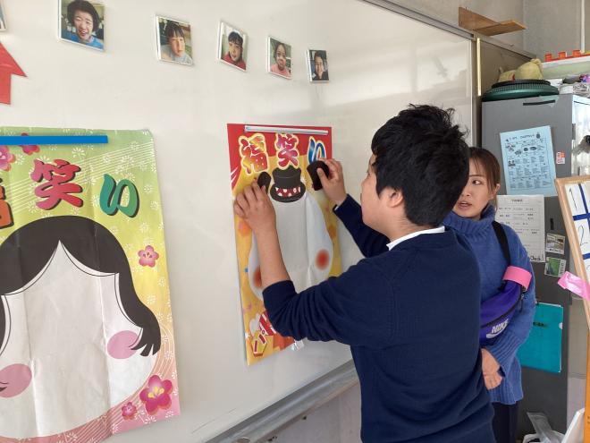 2月3日、小低集会で「節分」を行いました。クラスでイラストの鬼に向かって紅白球を投げて鬼退治の練習をした後、「赤鬼さん・青鬼さんの登場‼」ニコニコしながら紅白球で積極的に鬼退治したり、怖がりながらも何とか近づいて球を投げたり…それぞれ自分なりに鬼退治をすることができました。すっかり仲良し♡「やった~。赤鬼さんにだっこしてもらっちゃった☺」