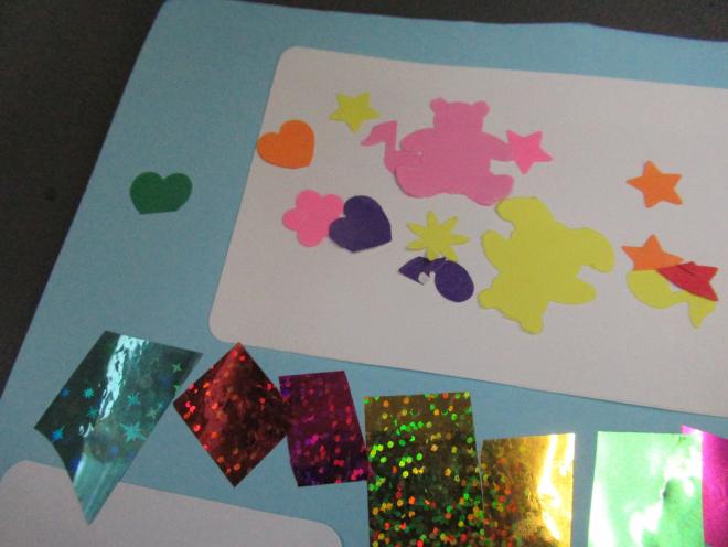 4月13日、ずこうで「たんじょうびれっしゃ」のかざりを作りました。みんなの顔のしゃしんや、かざりをのりではりました。ハートやお星さま、きらきらのかざりがとってもステキでしょ☆