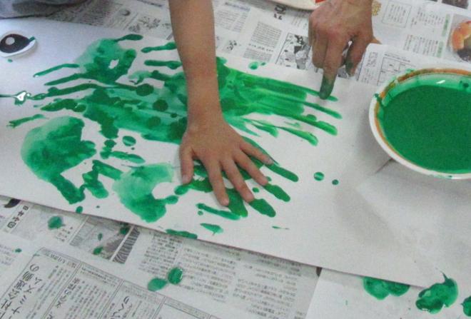 9月17日、ピンク、オレンジ、きみどりから好きな色を選んで、手のひらに絵の具をつけました。そして、友だちと互いのTシャツに自分の手形をぺったん、ぺったん。ダイナミックな手形Tシャツが完成です。