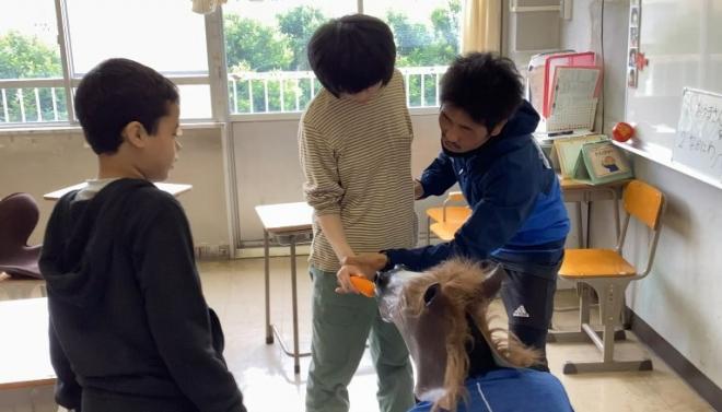 5月29日、乗馬体験に向けてお馬さんにニンジンをあげたり、乗馬したりする練習をしました。あまりにリアルな馬の被り物が突然現れてみんなビックリ!ドキドキしながらもみんな上手にニンジンをあげてお馬さんを喜ばせることができました^^