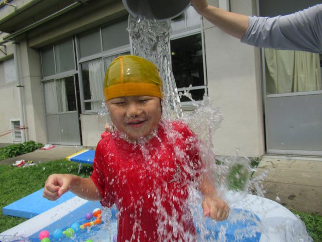 7月2日、暑さが増してきたので、中庭で水遊びをしました。ビニールプールで遊んだり、水鉄砲やじょうろを使ったりして、楽しく過ごしました。夢中になって水しぶきを浴びたり、水につかったりしながら満面の笑みを浮かべていました。