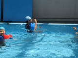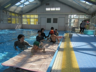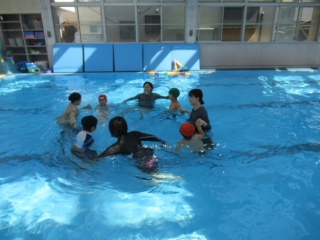 プールの中では歩いたり、ボールを集めたり、ワニ歩きでフラフープのトンネルをくぐるなど、楽しく活動しました!