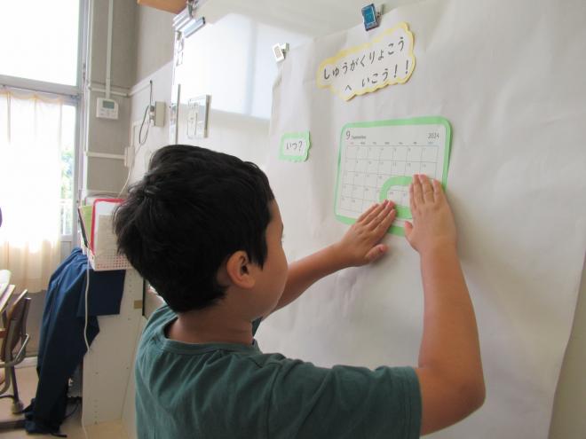 9月26日、27日の修学旅行に向けて、事前学習がスタートしました。第1回は、いつ行くのか・どこに行くのか等を確認しました。TVに映ったスライドを見た後、模造紙にカレンダーや八景島シーパラダイスの写真を自分たちで貼ることで確認することができました。