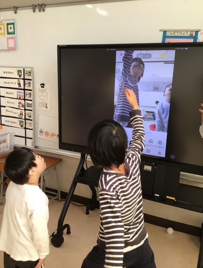 12月5日、朝の会までの少しの時間、電子黒板に映る自分たちを見てこれまでに見たことない動きや表情を発見・・カメラってたのしいね!!!