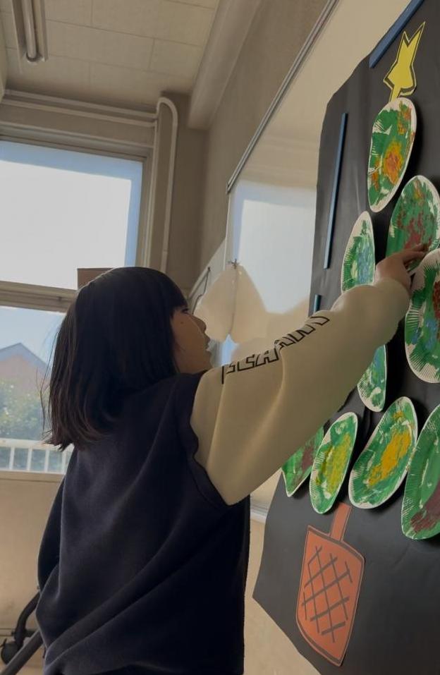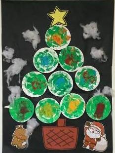 12月17、図工で紙皿に色をつけて飾りをつくりました。その紙皿を模造紙にペタペタ貼っていくと...大きなクリスマスツリーの完成☆!少しずつツリーができていく様子をじーっと見ていました♡