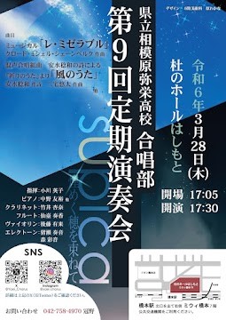 合唱部では、第9回定期演奏会を令和6年3月28日(木曜日)に「杜のホールはしもと」でおこないます。ミュージカル「レ・ミゼラブル」をはじめ、ジャズからポップス作品、先日の関東大会で演奏した曲など多岐にわたるプログラムです。歌ってダンスもできる合唱部の活気あふれるパフォーマンスで皆さんをお迎えいたします!是非いらしてください。